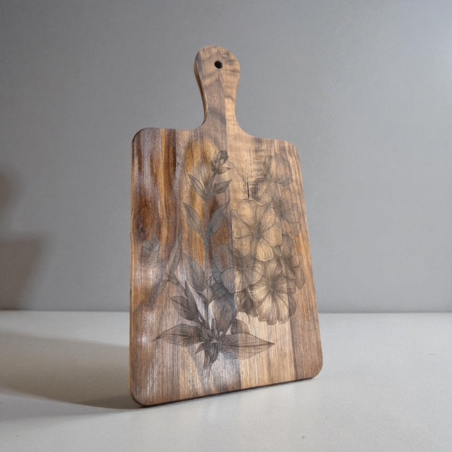 Celebrate Alaska's iconic wildflower with this stunning custom laser-engraved cutting board. Featuring the delicate beauty of fireweed, each piece is uniquely crafted to showcase this beloved symbol of the Last Frontier. Perfect for home cooks who appreciate regional heritage, this functional kitchen essential doubles as a conversation-starting décor piece. Whether you're preparing meals or displaying it proudly on your counter, this personalized cutting board brings Alaskan charm to every culinary moment. A meaningful gift for locals and Alaska enthusiasts alike.
