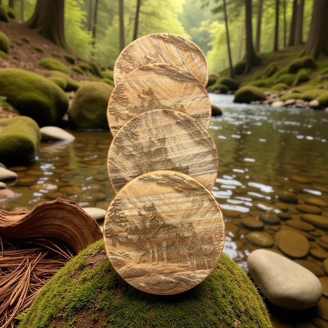 Bring the wild spirit of Alaska into your home with this striking Wolf Pack Coaster Set. Each coaster features a beautifully engraved design capturing the majesty of wolves in their natural habitat. Perfect for protecting your furniture while adding rustic charm to any room, this set makes an ideal gift for wildlife enthusiasts and Alaska lovers alike. Durable and distinctive, these coasters blend functionality with authentic Alaskan character. Don't miss out—add this unique piece to your collection today!